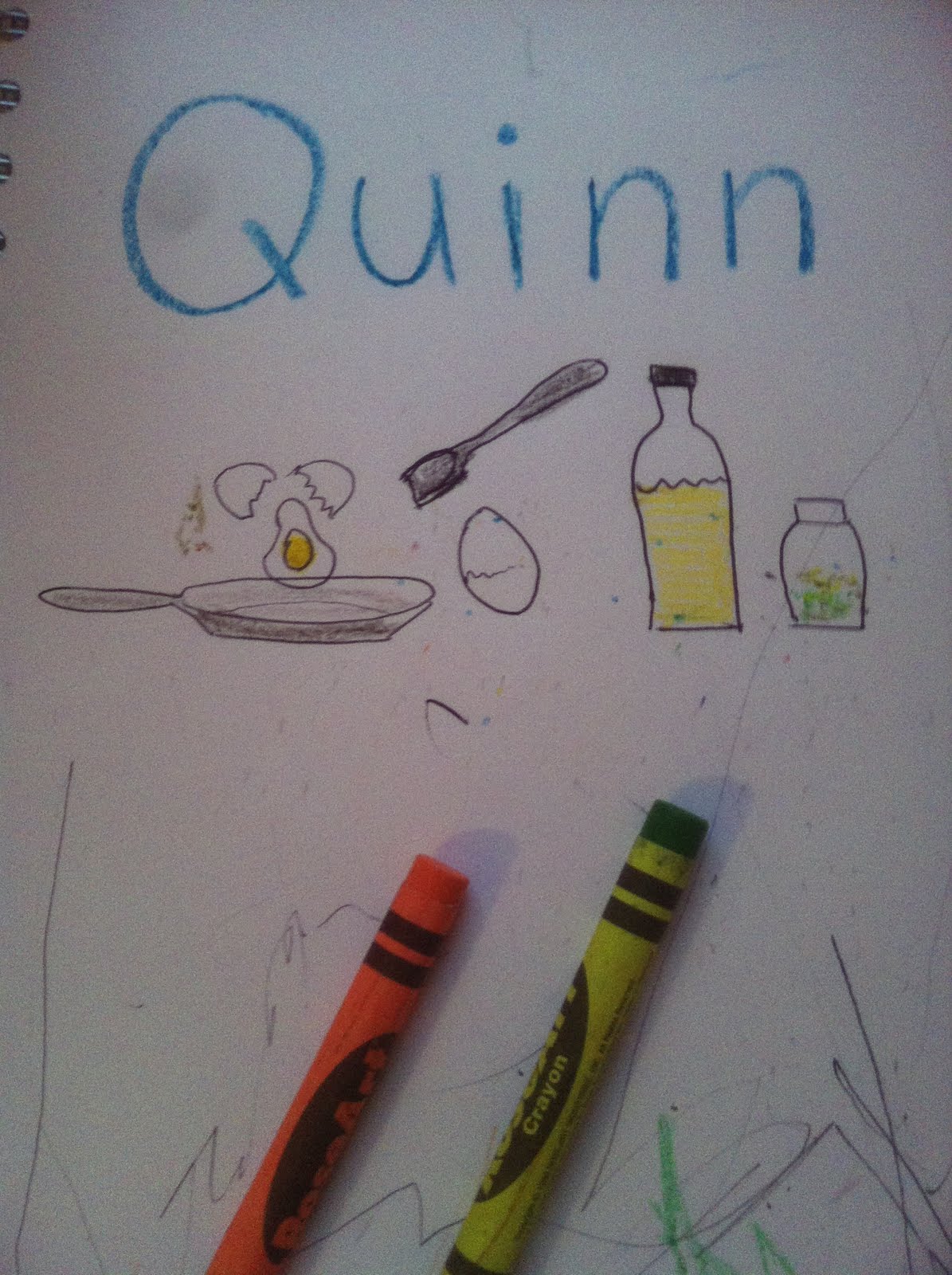 Working on communication, I asked Q the other day what we needed to make "eggies" as he calls them. During the conversation, we drew the items either he or I came up with, and it became kind of a visual recipe.